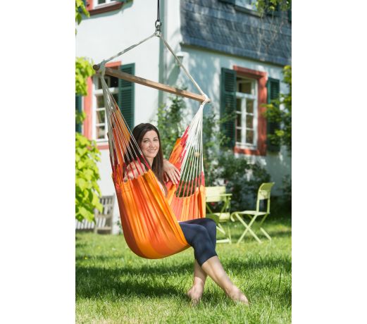 Décliné dans dans tons oranges et rouges, ce hamac chaise existe également en bleu et vert.