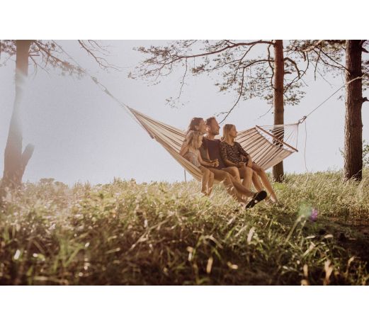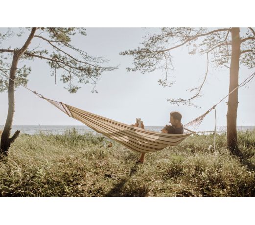 Nous sommes parvenus à rendre nos hamacs à barre aussi confortables que les classiques brésiliens qui n’en sont pas pourvus. Grâce à l’utilisation d’un fil de coton spécial, extrêmement doux, extensible et épais (350 g/m²), et aussi grâce au fait que nous rendons le tissu beaucoup plus large que la barre : 1,40 m pour une barre de 100 cm. On obtient ainsi une magnifique courbure, dans laquelle on est confortablement suspendu et on peut jouir d’un maximum de stabilité!