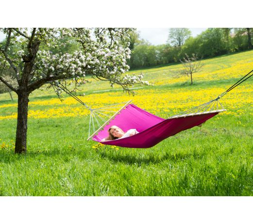 Ce hamac est uni dans des tons modernes de violet et offre ainsi une alternative jeune et moderne aux couleurs classiques des hamacs.