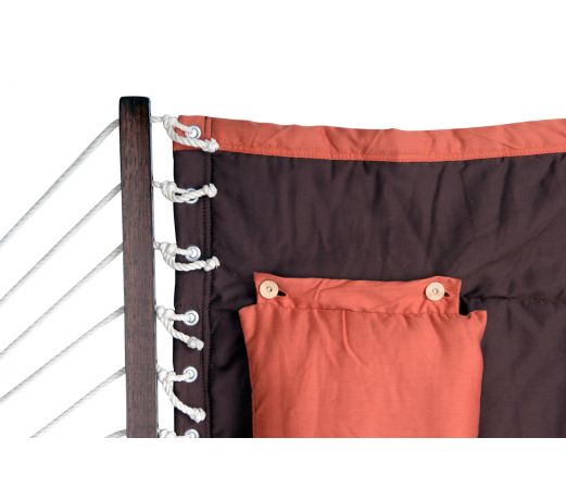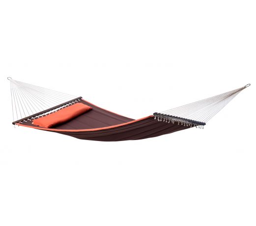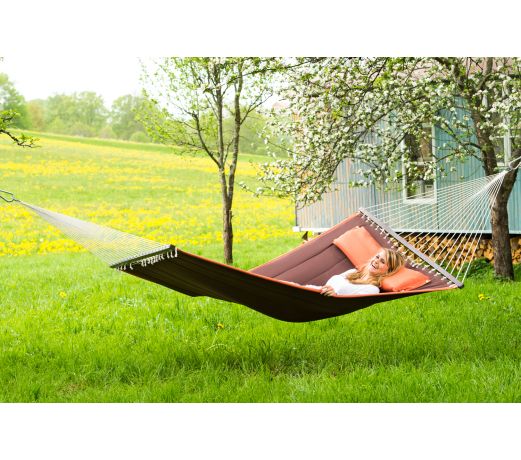 Un hamac chocolat avec des éléments orange plutôt réussis et un coussin fourni avec le hamac et amovible. Amazonas nous propose une toile suspendu très confortable.