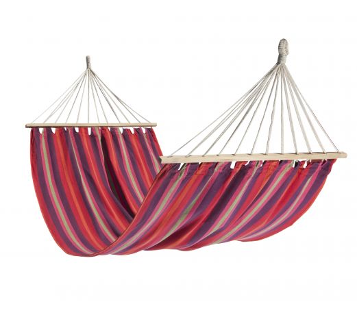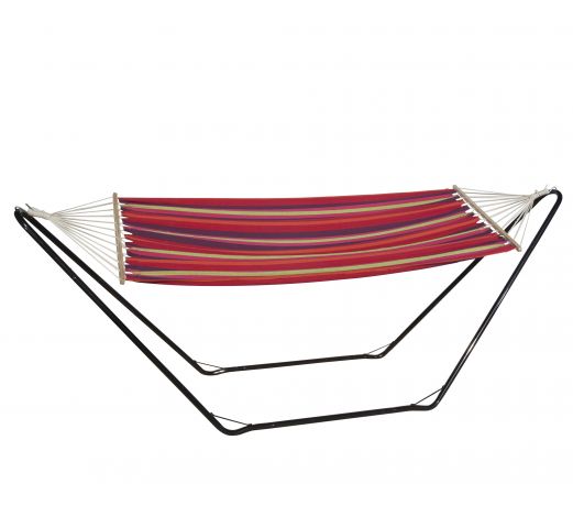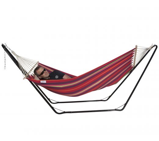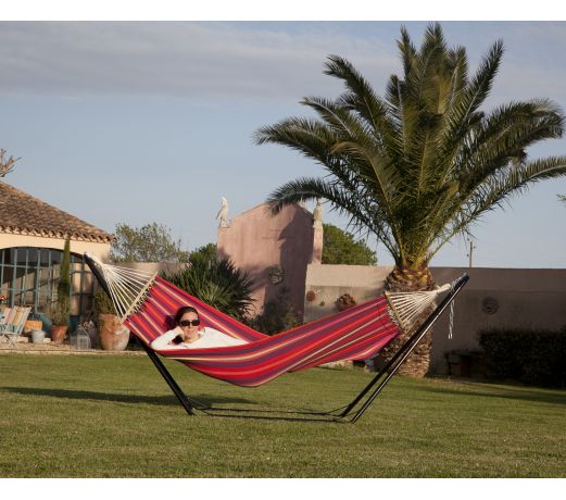 Un hamac avec support à prix canon. A déconseiller aux grands gabarits que nous orientons plutôt vers les sets Sagay + mansalay plus résistants et plus confortables.