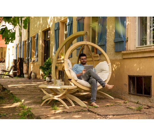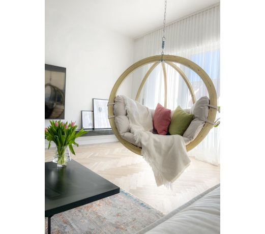 Le fauteuil suspendu Globo Chair est le lieu idéal pour se reposer. Il s’agit d’un ensemble de couches de bois d’épicéa très stable et résistant aux intempéries. Le Globo Chair dispose d’un grand coussin rembourré moelleusement qui rend parfait le confort.