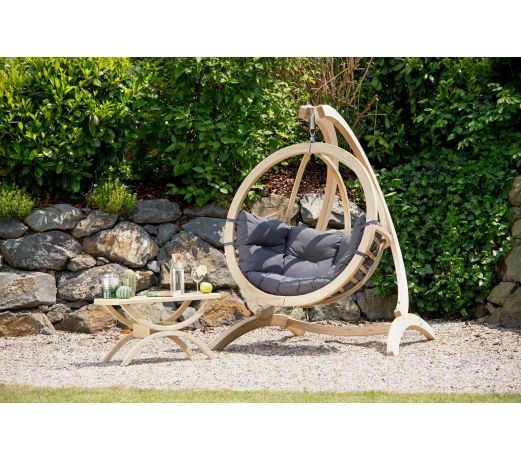 Le fauteuil suspendu Globo Chair est le lieu idéal pour se reposer. Il s’agit d’un ensemble de couches de bois d’épicéa très stable et résistant aux intempéries. Le Globo Chair dispose d’un grand coussin rembourré moelleusement qui rend parfait le confort.
