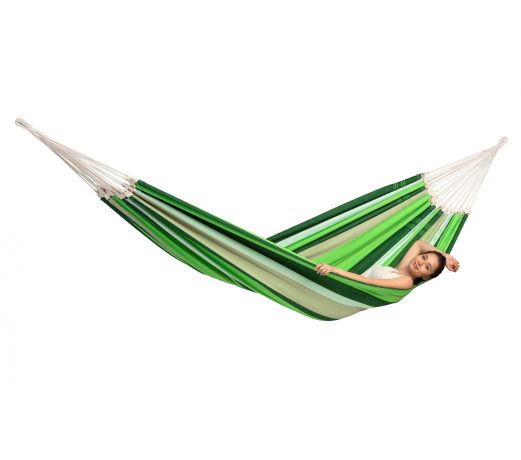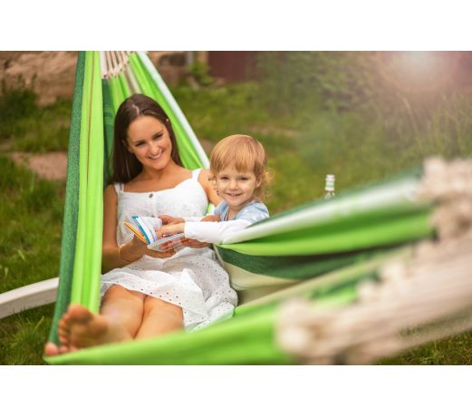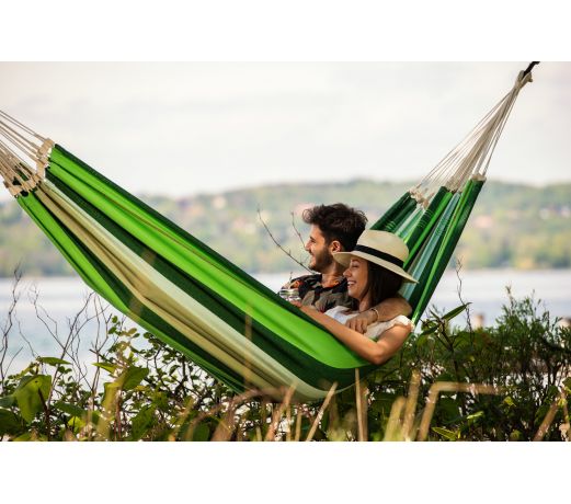 Oliva est la dernière couleur de la gamme de hamac familial Paradiso. Comme les autres déclinaisons, ce hamac est fabriqué au Brésil par Amazonas et contribue au développement économique d'un village avec lequel Amazonas a développé un partenariat via une association.